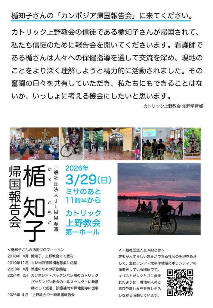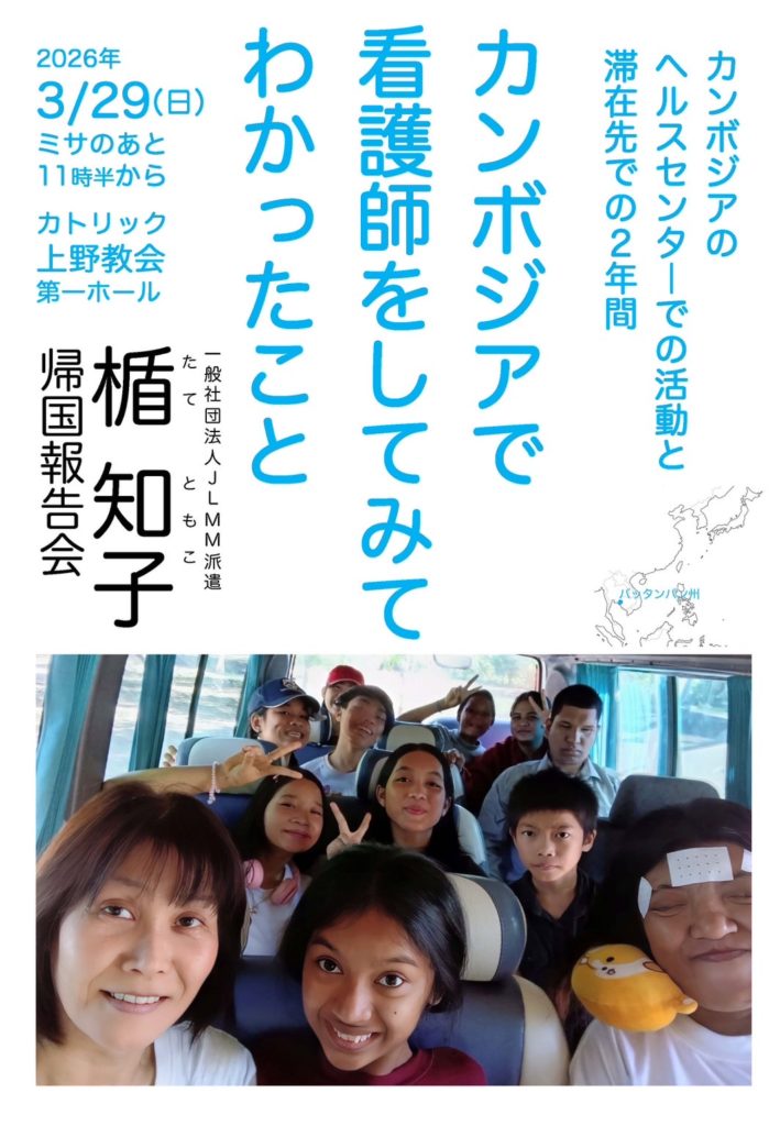 カンボジアに派遣されていた楯知子さんの帰国報告会です。お近くの方はぜひご参加ください! 日時:2026年3月29日(日)11時半から(10時ミサ後)会場:カトリック上野教会 第一ホール 参加費無料/予約不要 会場地図